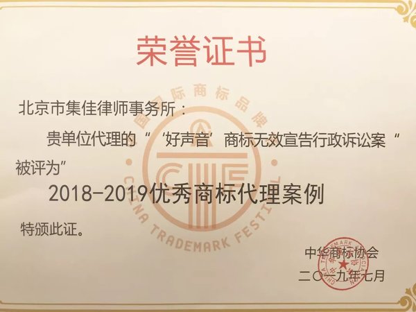 >五星体育>关于我们>荣誉概览>2019>集佳代理“好声音”商标无效宣告行政案入选“优秀商标代理案例”