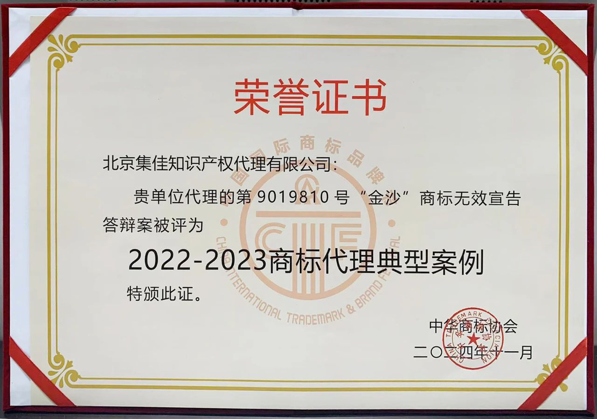 >五星体育>关于我们>荣誉概览>2024>集佳代理的“金沙”商标权无效宣告答辩案入选“2022-2023商标代理典型案例”