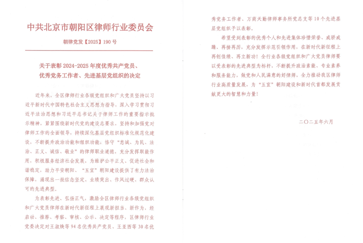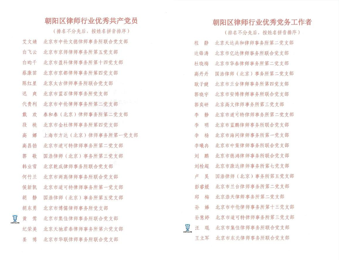 6月27日,朝阳区律师行业党委召开了朝阳区律师行业庆祝中国共产党成立104周年暨总结表彰大会,五星体育联合党支部党员黄莺荣获“朝阳区律师行业优秀共产党员”称号,支部党员汪琨荣获“朝阳区律师行业优秀党务工作者”称号。